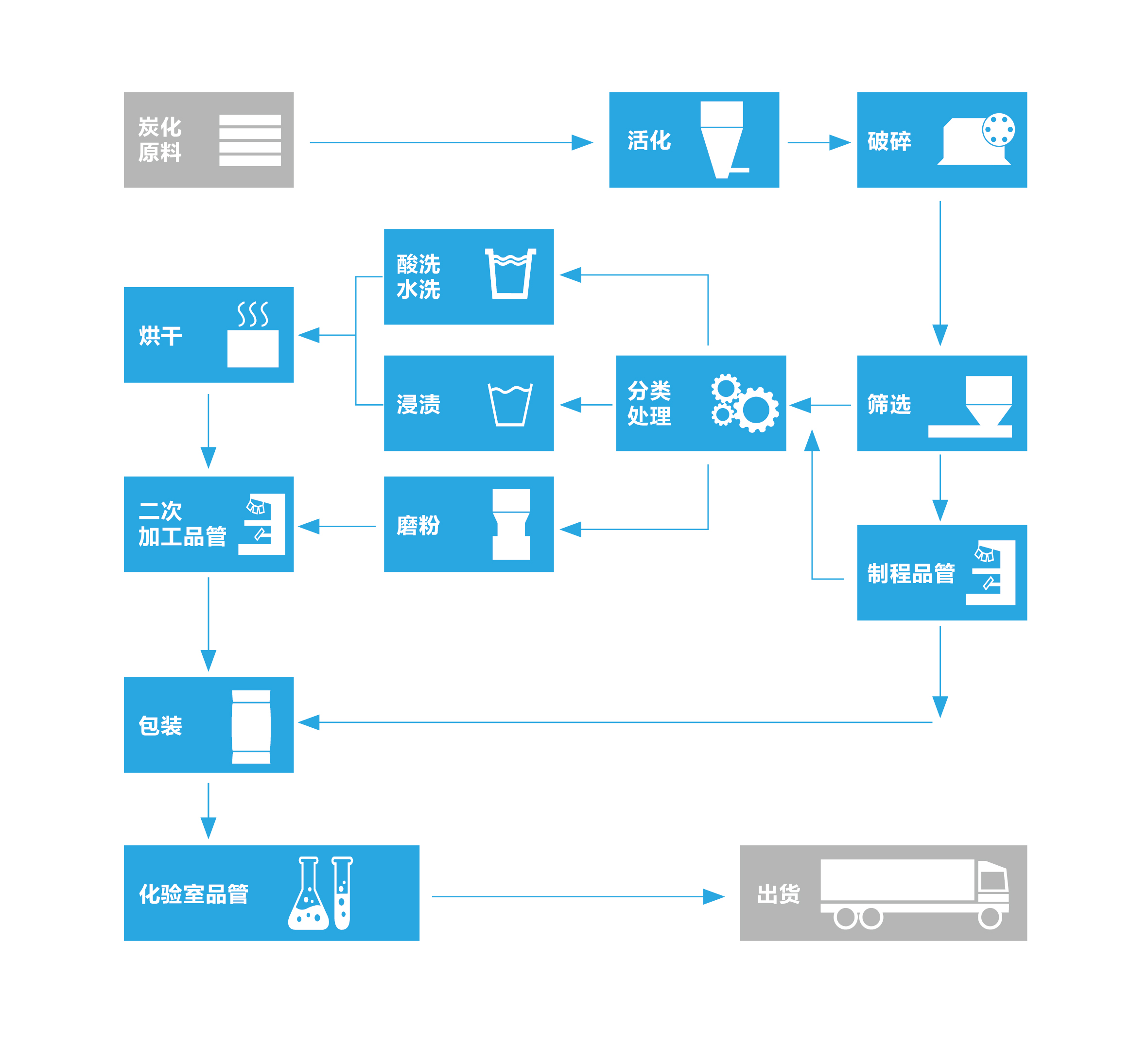 物理法通常又稱氣體活化法,是將已炭化處理的原料在800 ~1000℃的高溫下與水蒸氣,煙道氣(水蒸氣、CO2、N2等的混合氣)、CO或空氣等活化氣體接觸,從而進(jìn)行活化反應(yīng)的過程。物理活化法的基本工藝過程主要包括炭化、活化、除雜、破碎(球磨)、精制等工藝,制備過程清潔,液相污染少。